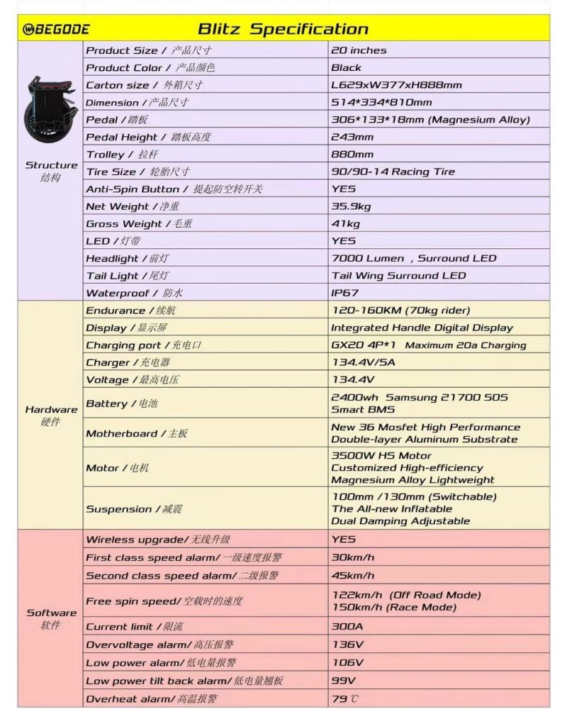 Begode Blitz määrittelee suorituskyvyn uudelleen kevyen rakenteensa ansiosta, sillä se on kevyempi kuin edeltäjänsä Master V4. Tämä sähkökäyttöinen yksipyörä painaa vain 36 kg (79,1 lbs), ja se on suunniteltu nopeutta varten. Pienempi paino on saavutettu käyttämällä laajasti magnesiumseosta moottorissa, akkukoteloissa ja muissa rakenneosissa. Se on luokkansa kevyin machine tinkimättä lujuudesta