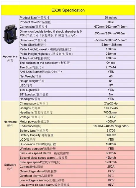 Ytimeltään Begode EX30 on tekniikan ihme. 3,9 tuuman (100 mm) jousitus on suunniteltu vaimentamaan minkä tahansa tien kuoppia ja notkelmia, ja vankat rakennusmateriaalit lupaavat kestävyyttä ja luotettavuutta kaikilla matkoillasi.