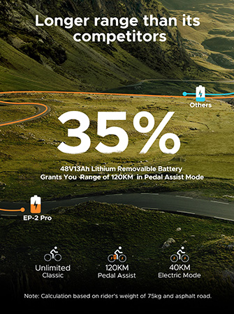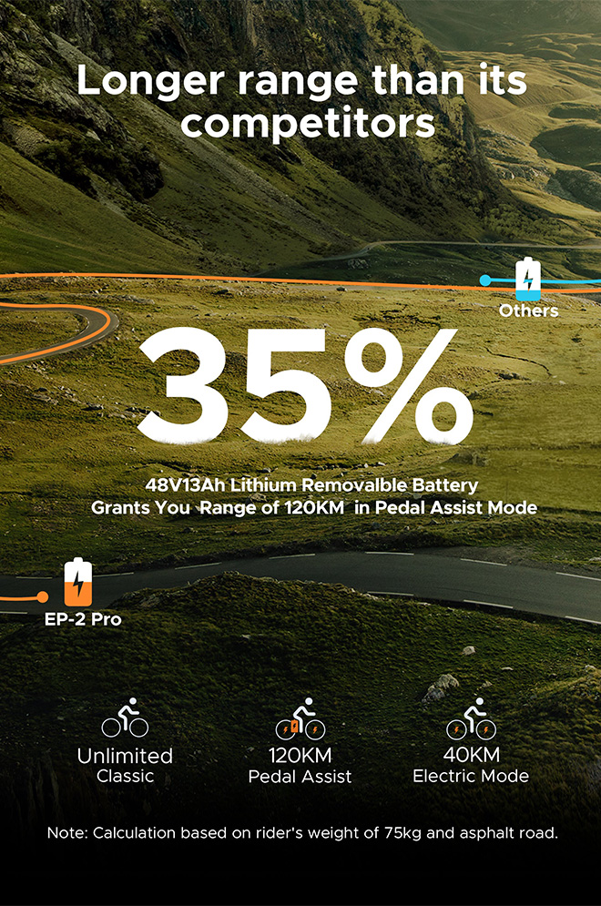 ENGWE EP-2 PRO on varustettu 48 V:n 13 Ah:n litiumakulla, ja sen toimintasäde on jopa 120 km (75 mi) yhdellä latauksella virta-avustustilassa. Akku on irrotettava. Voit ladata sen kätevästi kotona, autotallissa tai toimistossa.