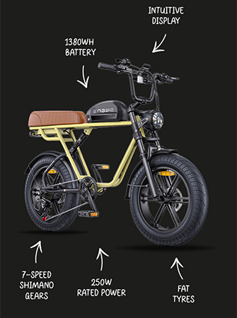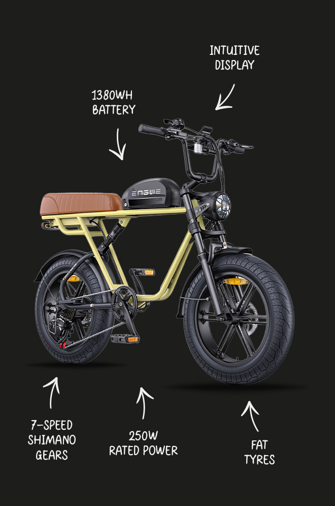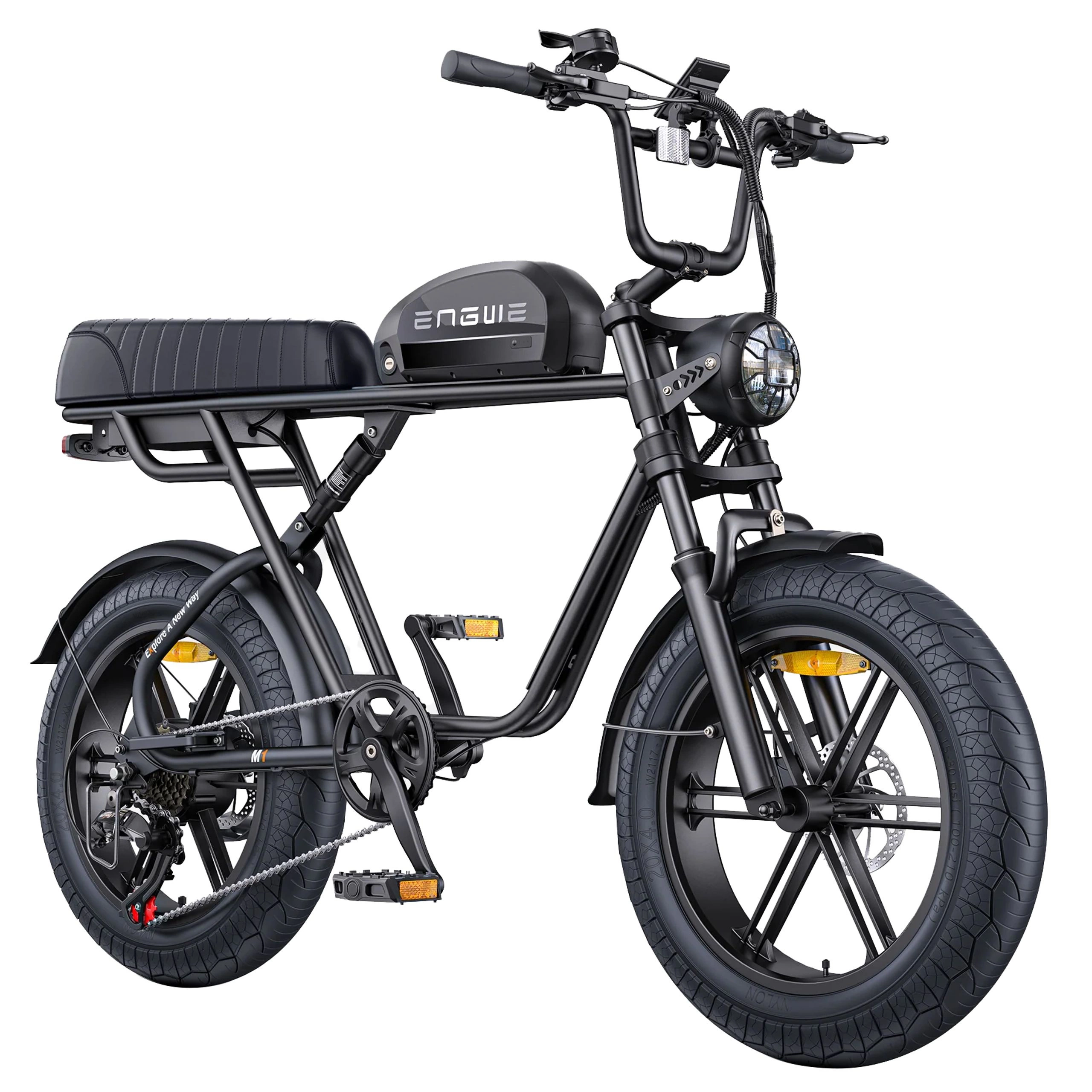 ENGWE M1 -sähköpyörässä yhdistyvät kompakti muotoilu ja vaikuttava toimintasäde. Tämä kahden matkustajan sähköpyörä pakkaa 250 W:n moottorin kaupunkielämää varten rakennettuun minirunkoon. Se tarjoaa vaikuttavan 105,5 mi (170 km) kantaman ja mukavat istuimet kahdelle. Se sopii täydellisesti niille, jotka haluavat jakaa matkansa tai tarvitsevat lisää kuormatilaa.