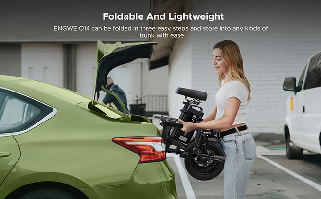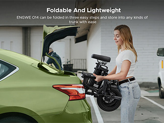 ENGWE O14 -sähköpyörä painaa vain 26,9 kg (59 lbs). Sitä on helppo kuljettaa ja säilyttää. Sen kokoontaitettavan rakenteen ansiosta se voidaan tiivistää 75x35x64 cm:n kokoiseksi, joten se sopii erinomaisesti kuljetettavaksi auton tavaratilassa tai säilytettäväksi pienissä tiloissa.