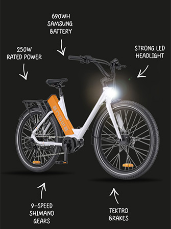 Sähköpyörän mukana toimitetaan tukevat seosmetallisuojalokasuojat, kestävä takateline ja integroitu etuvalo (sekä akkukäyttöinen takavalo). Vasemman peukalon vieressä olevalla LCD-näytöllä ohjataan neljää tehotasoa. Tektron hydrauliset levyjarrut tarjoavat luotettavan pysäytystehon.