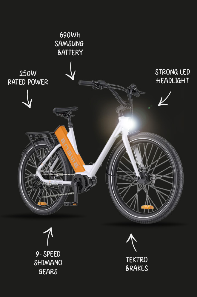 Kaupunkiajoon suunnitellussa ENGWE P275 ST:ssä on Tektron hydrauliset levyjarrut luotettavaa jarrutustehoa varten, 9-vaihteinen Shimanon vaihteistonvaihtaja sujuvia vaihteiden vaihtoja varten ja puoliksi liukkaat pallorenkaat, joissa pito ja tehokkuus ovat tasapainossa. Siinä on myös tukevat alumiiniseoslokasuojat, kestävä takateline ja integroitu valaistus, jotka takaavat turvallisuuden ja käytännöllisyyden kaikissa sääolosuhteissa.