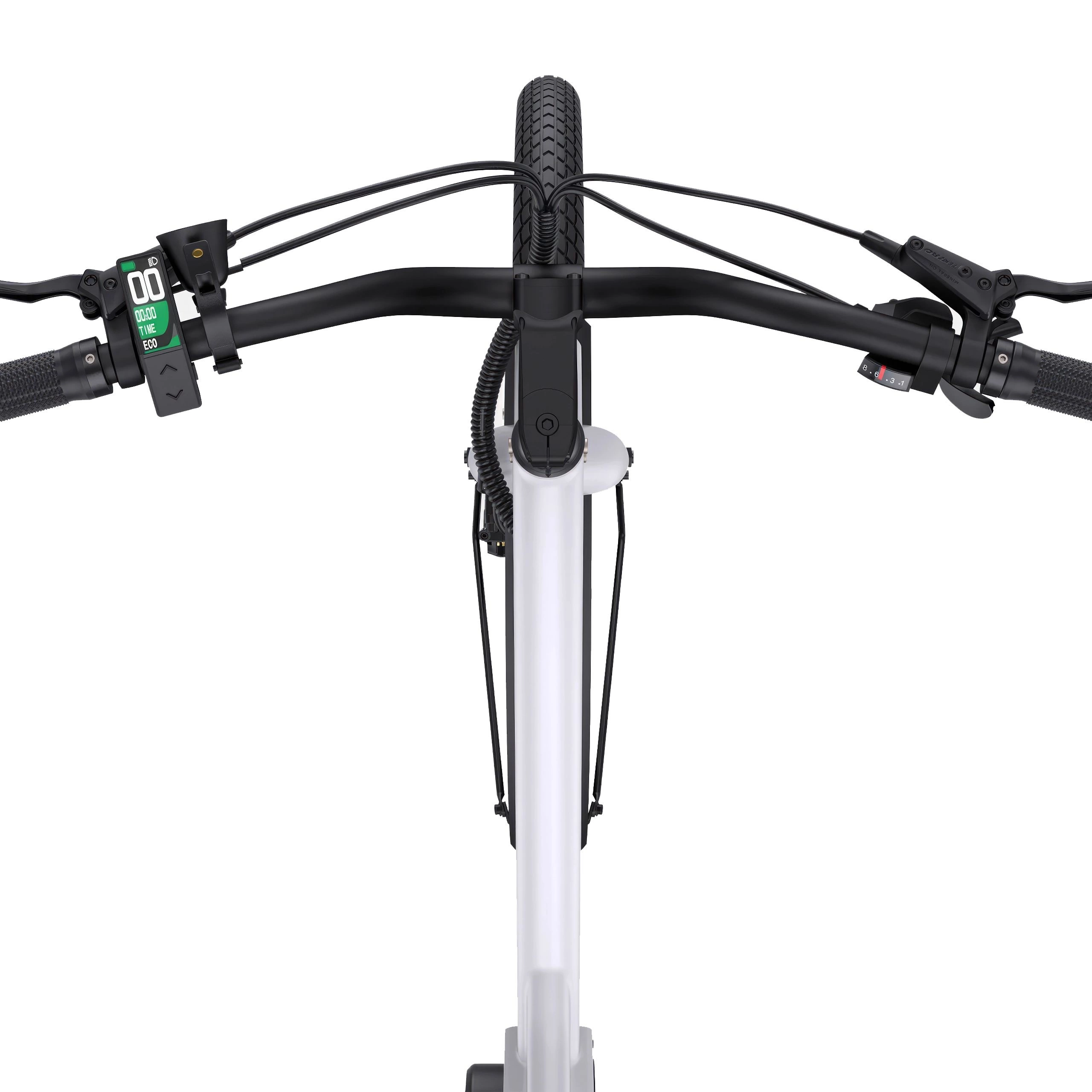 Step-through-kehys takaa helpon kiinnittämisen ja irrottamisen, joten se on ihanteellinen kaikenikäisille käyttäjät. Leveä lehmänsarviohjaustanko, pysty ajoasento ja mukava satula takaavat vakaan ja miellyttävän työmatkakokemuksen myös pidemmillä matkoilla.