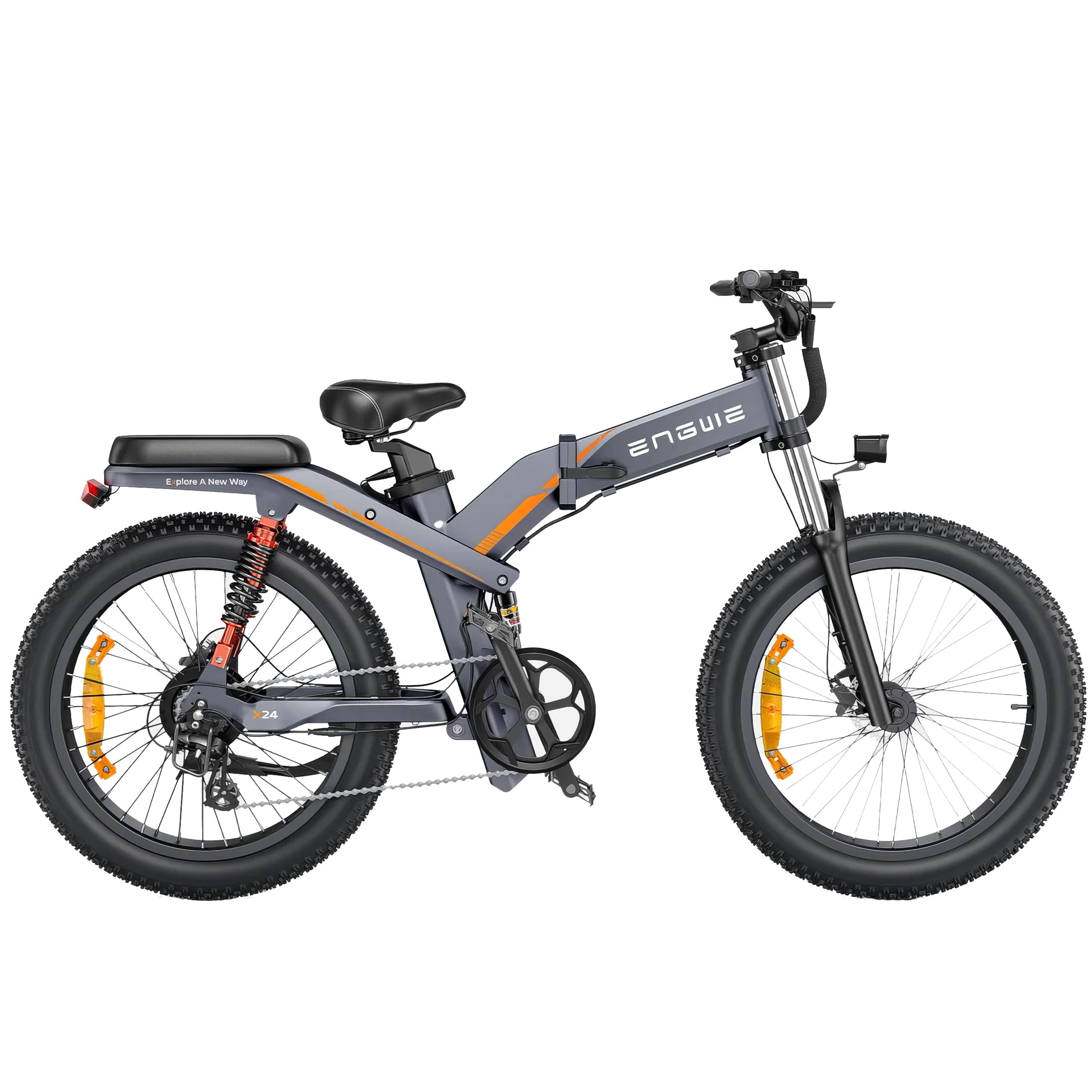 ENGWE X24 on kokoontaitettava sähköpyörä, joka on valmis valloittamaan minkä tahansa maaston. Tehokas 1000 W:n moottori, kaksi akkua, kaksoisjousitus ja paksut renkaat on suunniteltu työmatkoihin ja maastoseikkailuihin. Aja luottavaisin mielin hydraulisten levyjarrujen ja 8-vaihteisen Shimano-vaihteiston ansiosta .