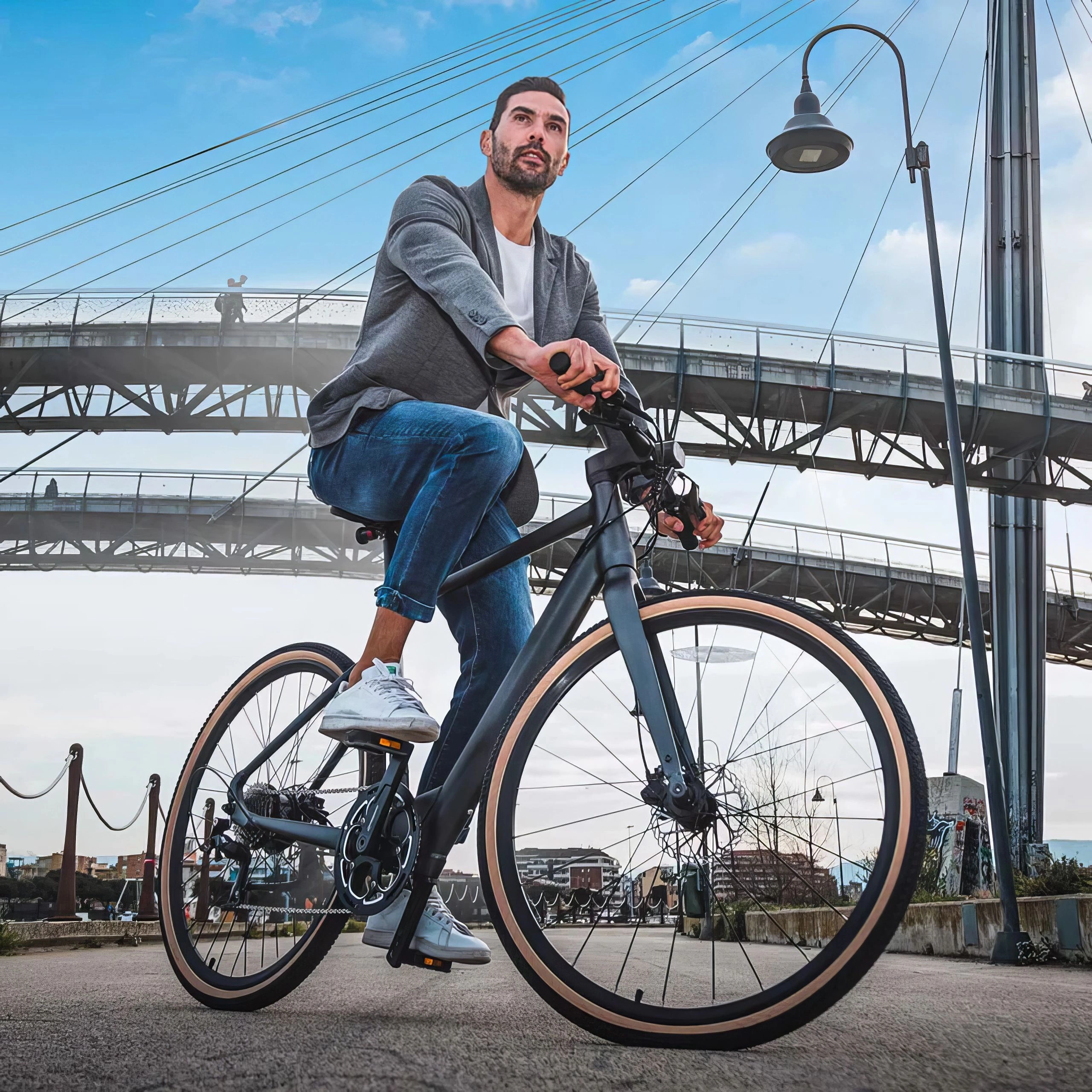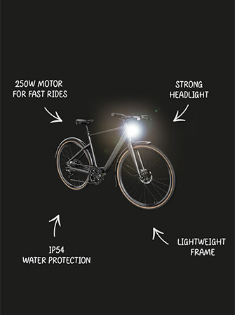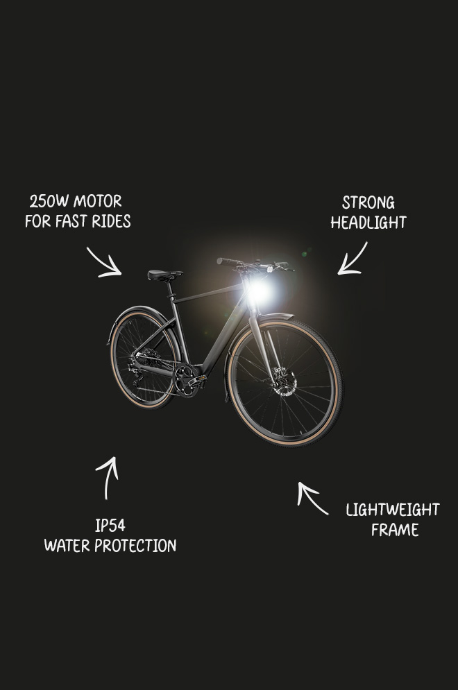 Puhdas ulkonäkö, älykäs muotoilu: C21 pitää asiat yksinkertaisina mattamustalla rungolla, joka kätkee sisäänsä sähkötehon. 700c-pyörät ja ruskehtavat renkaat antavat sille klassisen maantiepyörätyylin. Piilotetut kaapelit ja sisäänrakennettu akku pitävät kaiken siistinä, ja laadukkaat jarrut ja näyttö osoittavat, että pyörä on tosissaan.