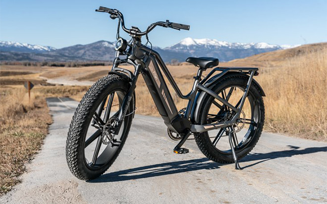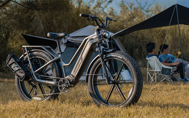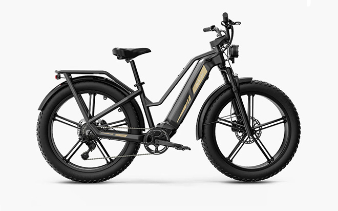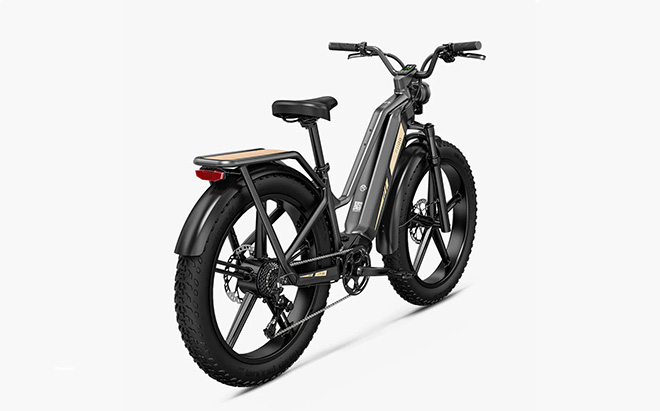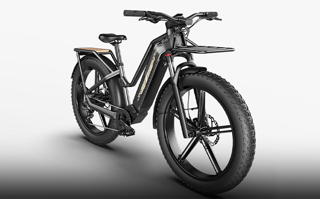 Fiido Titan on tyylikäs mattamusta, ja siinä on isot 26-tuumaiset pyörät, jotka tarkoittavat asiaa. Leveät 4-tuumaiset renkaat ja vankka musta runko osoittavat, että tämä pyörä on valmis kaikkeen. Etuteline sopii täydellisesti kovaan ulkonäköön.