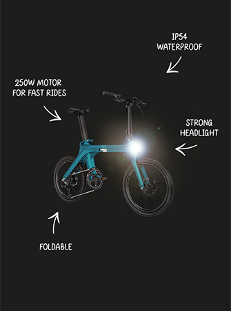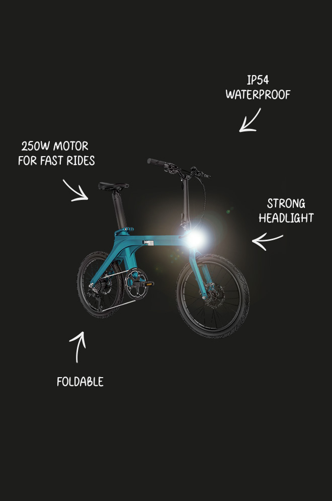 Pyörä on suunniteltu käteväksi, ja se taittuu vain 5 sekunnissa piilotetun kaksoissaranajärjestelmän ansiosta. Vain 19,8 kg:n (43,7 lbs) painonsa ansiosta se on kevyt mutta tukeva, joten sitä on helppo säilyttää, kuljettaa ja kuljettaa.