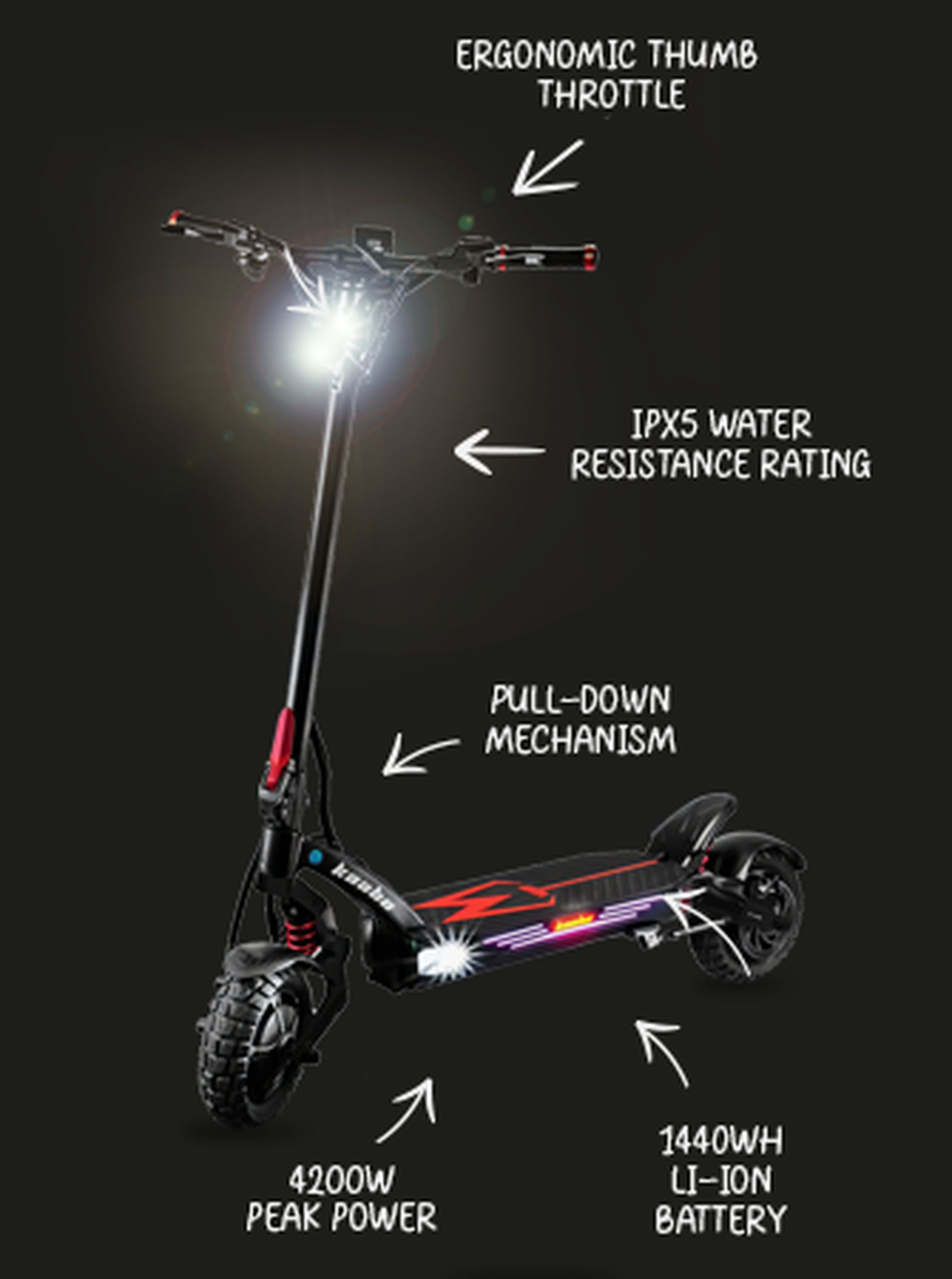 Kaabo Mantis King GT -sähköpyörässä sähköinen skootteri on kaksi 1100 W:n moottoria, joiden yhteenlaskettu huipputeho on yli 4000 W. Tämä vankka yhdistelmä takaa nopean kiihtyvyyden ja saavuttaa 70 km/h huippunopeuden