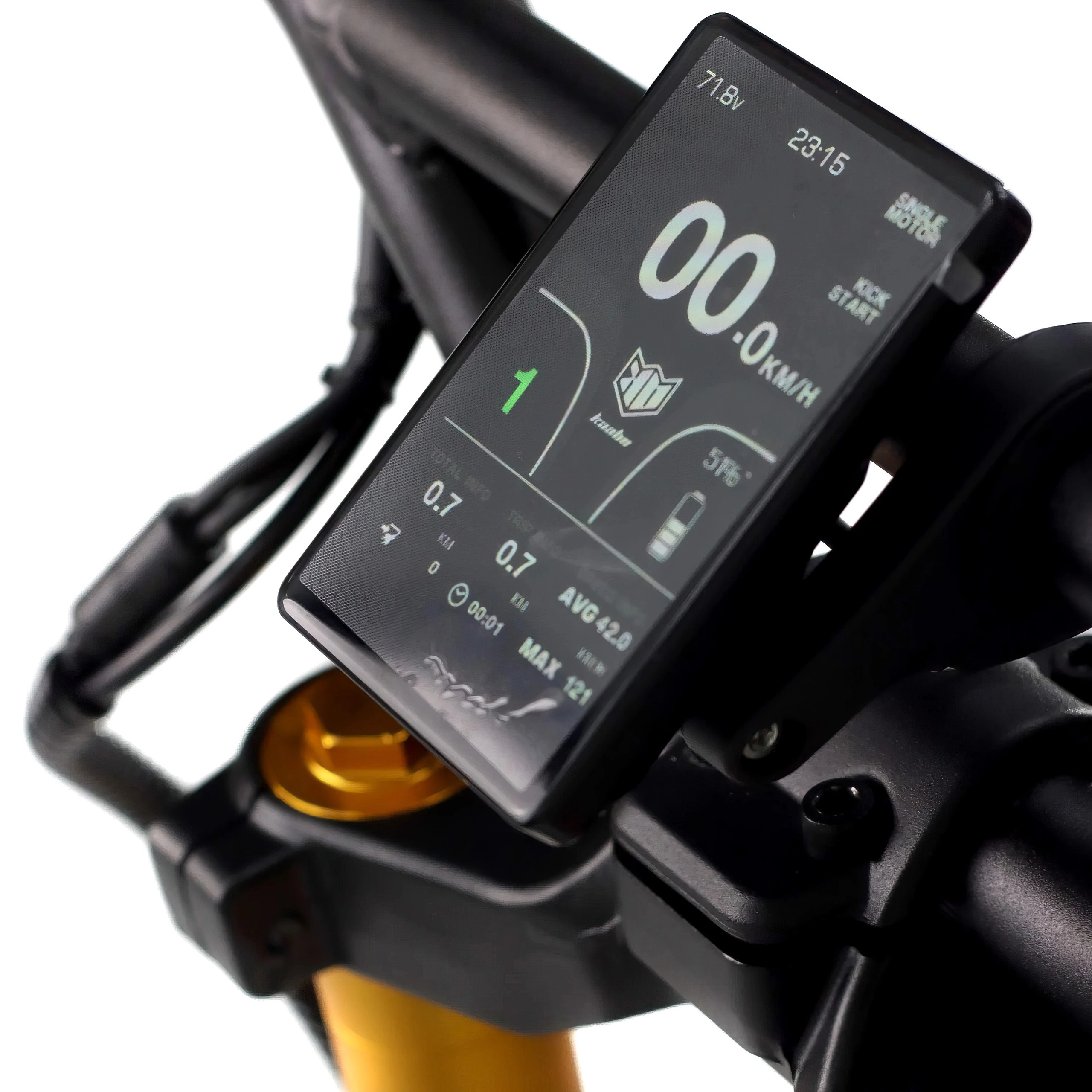 Pysy ajan tasalla ja hallinnassa 4,2 tuuman TFT-värinäytön avulla. Sieltä löydät kaikki tarvittavat tiedot, kuten nopeuden ja jäljellä olevan toimintasäteen. Häikäisysuojauksen ja automaattisen himmennyksen ansiosta asetusten tai toimintatilojen säätäminen on helppoa. Turvallisuutesi vuoksi siinä on salasanasuojaus. Reagoiva peukalokaasupainike takaa hienovaraisen nopeuden modulaation.