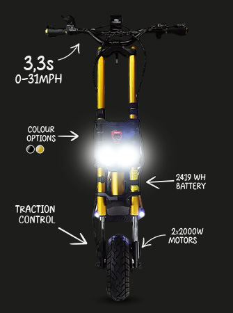 Tämä sähköinen sähköinen skootteri on varustettu kahdella 2000 W:n moottorilla, joiden huipputeho on 13440 W, ja se saavuttaa henkeäsalpaavan 100+ km/h (62+ mph) huippunopeuden, ja sen toimintasäde on jopa 180 km (112 mailia).
