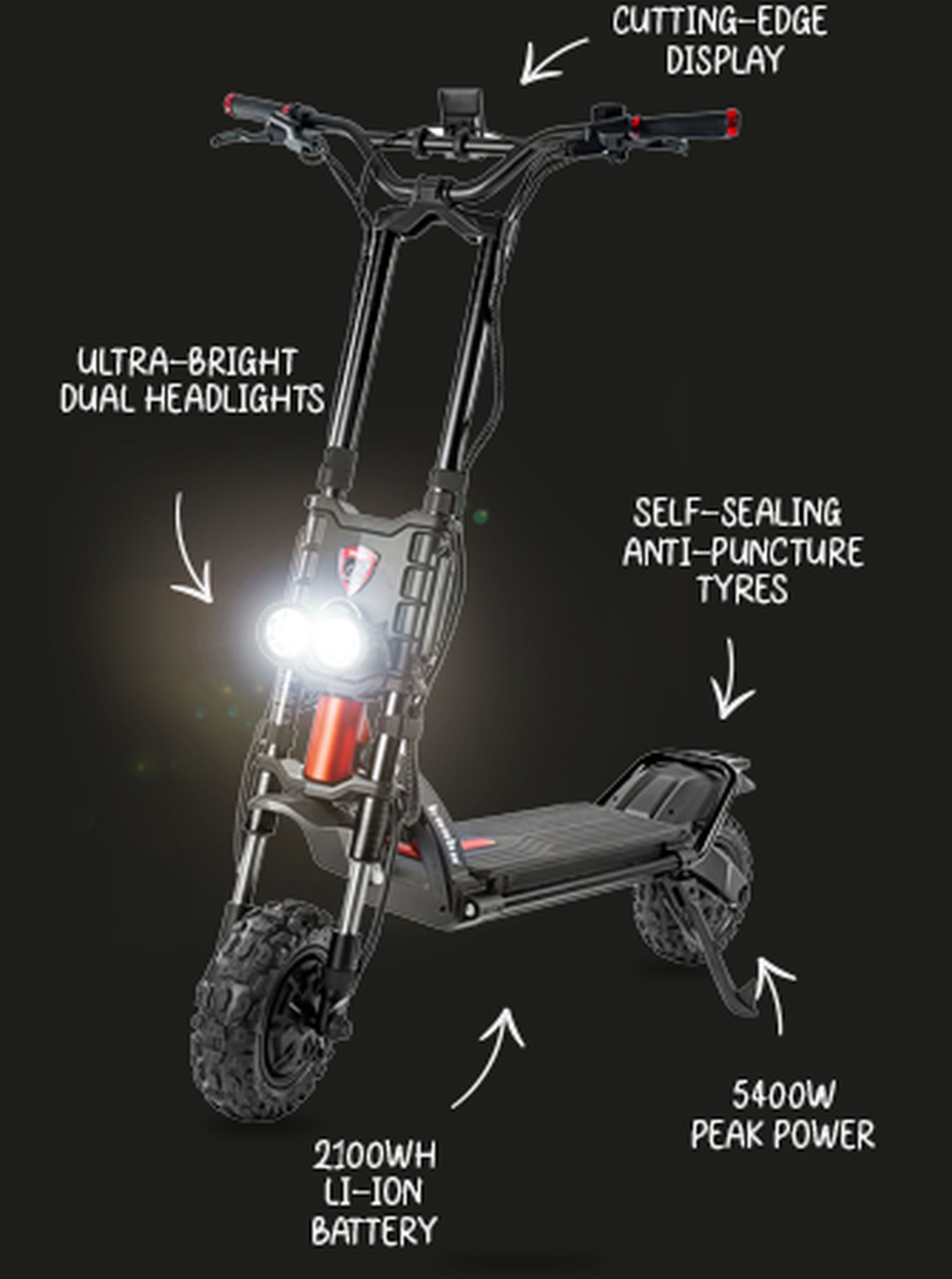 Kaabo Wolf Warrior GT Pro määrittelee uudelleen sähköisen sähköinen skootteri maiseman vertaansa vailla olevalla tehollaan ja vankalla muotoilullaan. Tämä peto on suunniteltu niille, jotka eivät suostu tinkimään nopeudesta, kestävyydestä ja teknisistä ominaisuuksista. Olipa kyse sitten maanteistä tai karuista poluista, Wolf Warrior GT Pro on ehdoton liittolaisesi